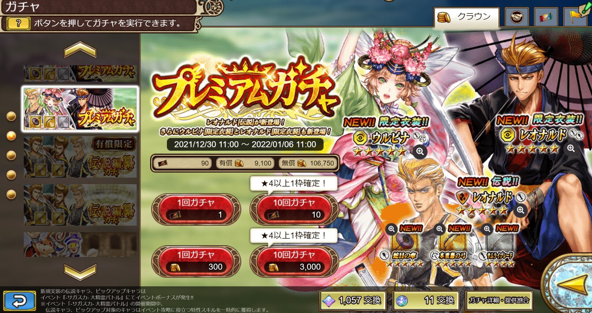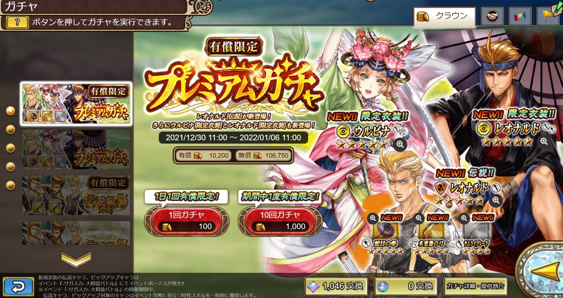 さて、新年を控えて始まったシリーズイベントはサガスカ、新キャラは揃って和装でしたね。新規ウルピナが自己奮起持ちですし、そうでなくても奮起付与の奥義持ちは少ないので、これは皆と一緒に死地へ赴くしかないワケか……と思いながらの、有償割引分から。