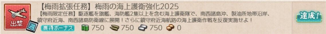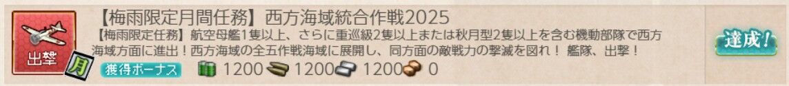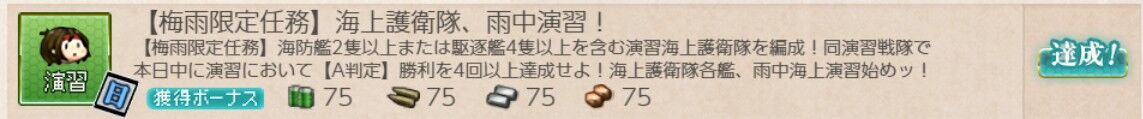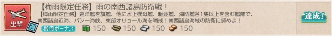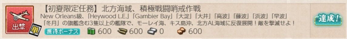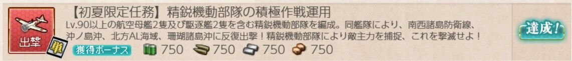 続いて、初夏任務の方に移動して、指定艦の文が長くて目が滑るやつ。敢えてゴミザコ駆逐を入れてAL行かないといけないのがダルい、くらいですかね。件のALで、
