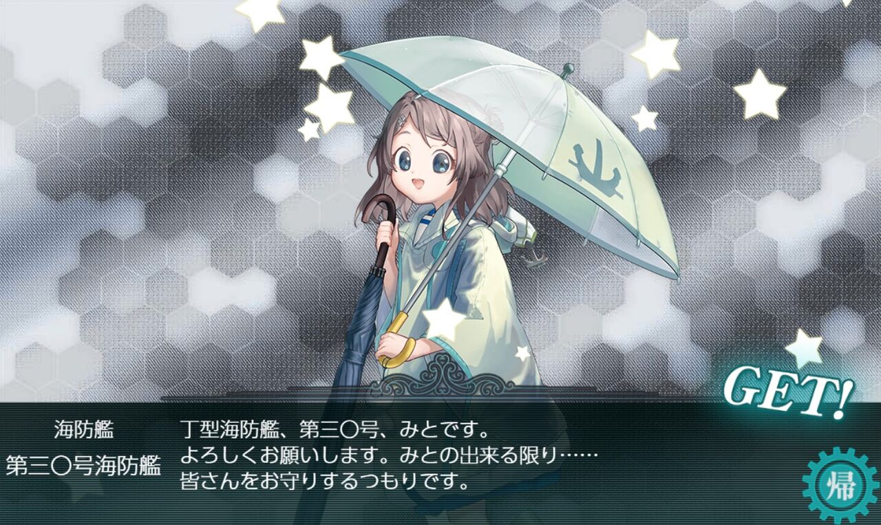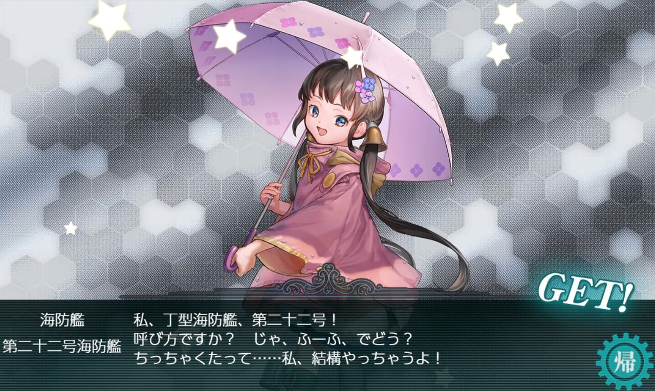 直近でいろんなところに行って出たのを一気に。丁型海防艦組に至っては、2セット出ましたからね? 1セット目は、素で耐久アップに使おうとして失敗しましたが……。レベル上げるのもめんどくさいんだよな、タダでさえ演習で育成出来ないように妨害されてる状態ですからね?