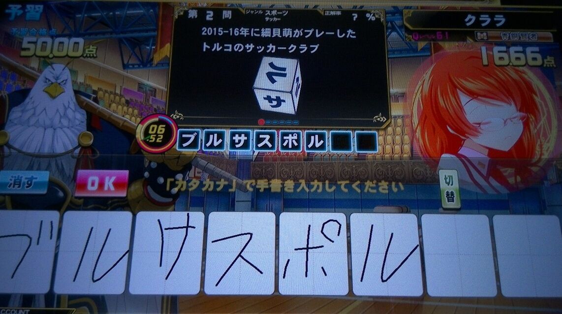 手書き問題がまた溜まりましたので、消化ということで。ようやく分かって来たけど、この出題形式のポイントは、ギリギリ認識されるくらいの汚い字を敢えて書くことだな。1問目のなんて、厳密に言えば間違ってますからね。後、拗音の表記に無茶苦茶厳しいということも分かった。完全に小さく書かないと認識されないもんな。何でそんなとこだけ厳しいんだか?